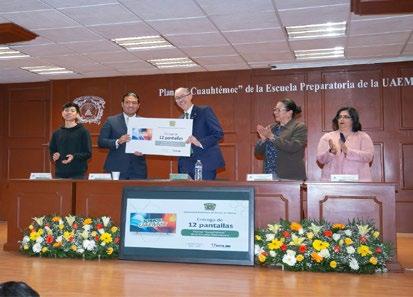 Con el objetivo de fortalecer las actividades académicas en beneficio del estudiantado, el rector de la Universidad Autónoma del Estado de México (UAEMéx), Carlos Eduardo Barrera Díaz, entregó 12 pantallas de 65 pulgadas en el Plantel “Cuauhtémoc” de la Escuela Preparatoria.