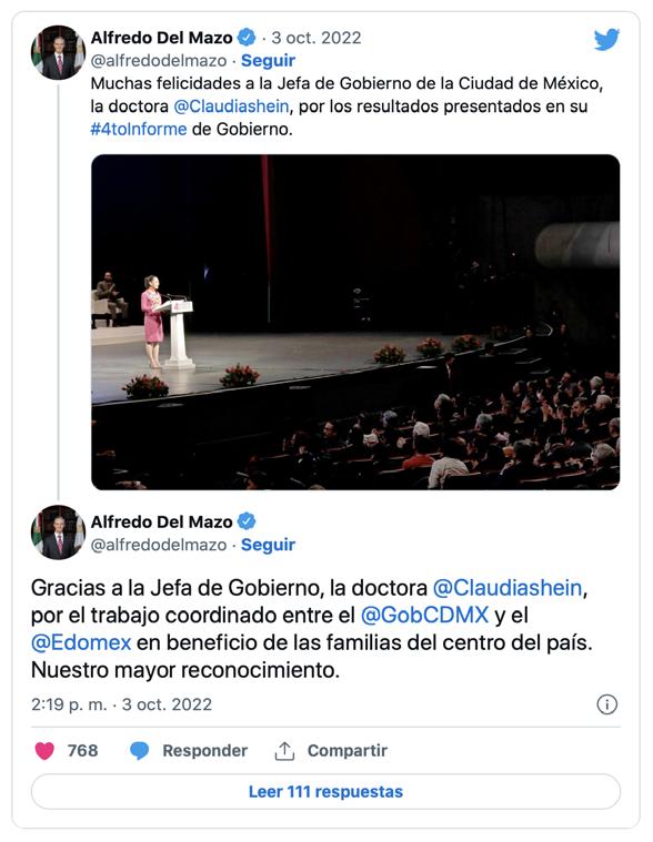 El gobernador del Estado de México, Alfredo del Mazo, felicitó a la jefa de Gobierno de la Ciudad de México, Claudia Sheinbaum, con motivo de su cuarto informe de gobierno que ofreció este lunes. Destacó, además, el trabajo coordinado entre ambas entidades para favorecer a la población en su conjunto. “Muchas felicidades a la Jefa de Gobierno de la Ciudad de México, la doctora @Claudiashein, por los resultados presentados en su #4toInforme de Gobierno”.