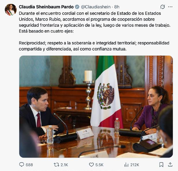 El comunicado conjunto emitido ayer por los gobiernos de México y EEUU tras la visita del secretario de Estado Marco Rubio a la presidenta Claudia Sheinbaum enfatiza la cooperación en seguridad