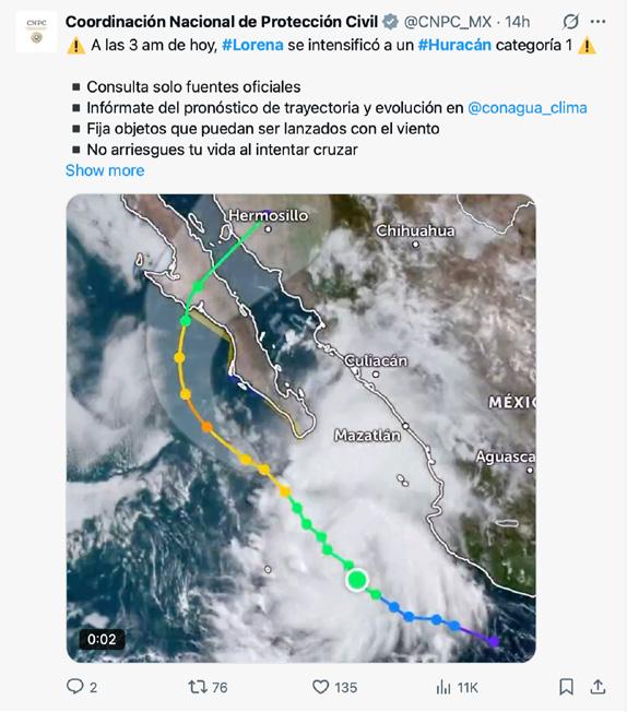 La Comisión Nacional del Agua (Conagua) alertó que el huracán Lorena de categoría 1 continúa intensificándose paralelo a costas de Baja California Sur. Lo anterior, debido a que su centro se localizó a 255 km al oeste de Cabo San Lucas y 220 km de Cabo San Lázaro, localidades de la entidad. De acuerdo con el comunicado, Lorena mantiene vientos máximos sostenidos de 130 km/hora, rachas de 160 km/hora y desplazamiento hacia el noroeste a 24 km/hora.