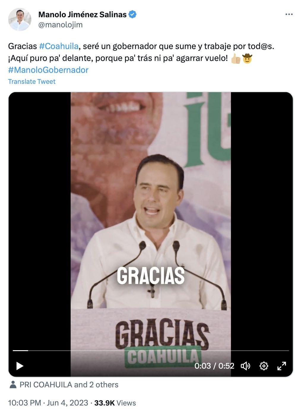 Gracias Coahuila, seré un gobernador que sume y trabaje por tod@s. ¡Aquí puro pa’ delante, porque pa’ trás ni pa’ agarrar vuelo!”