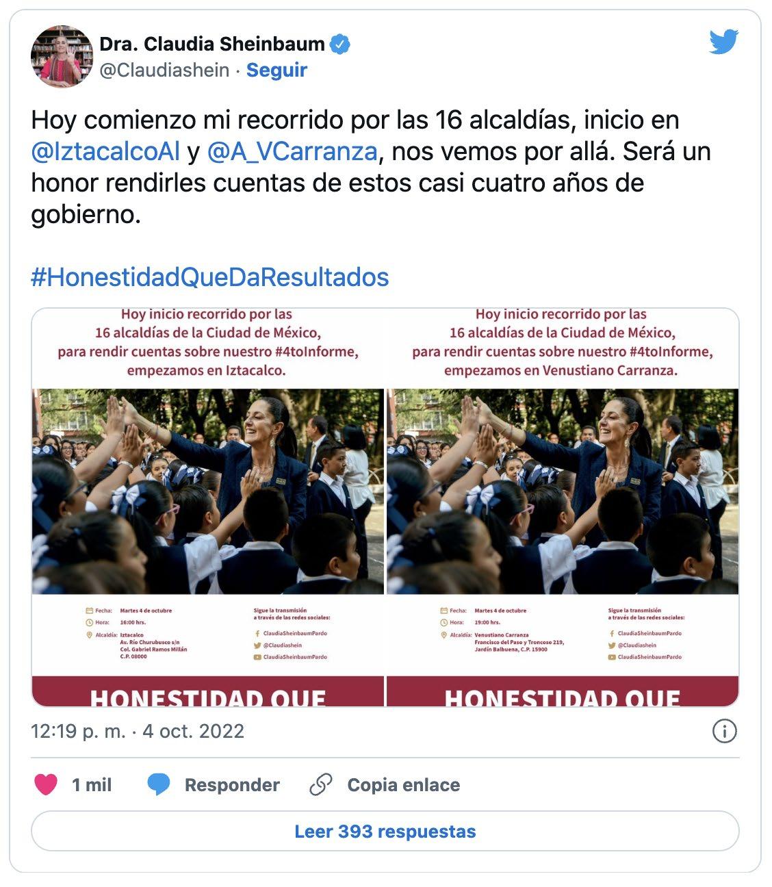 Hoy comienzo mi recorrido por las 16 alcaldías, inicio en Iztacalco y Venustiano Carranza, nos vemos por allá. Será un honor rendirles cuentas de estos casi cuatro años de gobierno.”