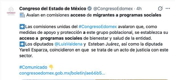 mexiquenses se les garantice el reconocimiento de los derechos humanos de las personas migrantes, al permitirles acceder a servicios y prestaciones sociales sin discriminación. La medida, impulsada por el diputado Edmundo Luis Valdeña destacó que se trata de un paso relevante en materia de inclusión y justicia social, coherente con la política de bienestar impulsada por la gobernadora Delfina Gómez Álvarez, cuyo eje central es “que nadie se quede atrás”.