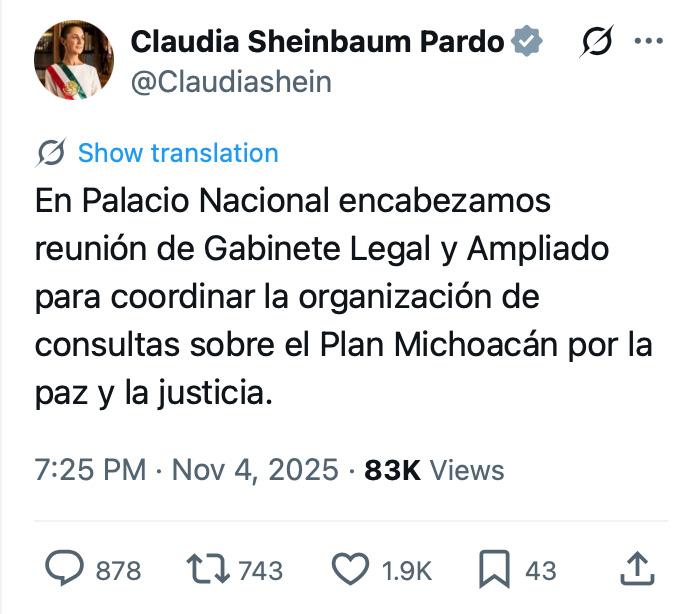 “En Palacio Nacional encabezamos reunión de Gabinete Legal y Ampliado para coordinar la organización de consultas sobre el Plan Michoacán por la paz y la justicia”, dijo Sheinbaum Pardo en sus redes sociales.