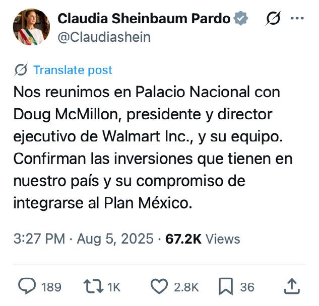 CEO de Walmart>> se reúne con la presidenta Claudia Sheinbaum; reafirma inversiones en México