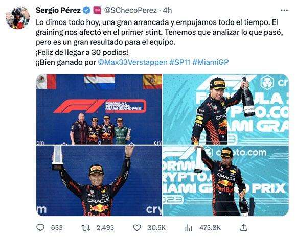 El tapatío hizo un gran trabajo, fue líder las primeras 20 vueltas y algunas casi al final, con el cuidado de gomas que lo caracteriza y también con el buen control de su RB19, pero ante la fuerza que manejó todo el tiempo su coequipero, Pérez dejó en las últimos giros el objetivo de ser primero para cómodamente instalarse en el segundo, subir de nuevo al podio (el 30 en su carrera) y seguir peleando con Max por la punta del campeonato este año. Esta vez los Ferrari no fueron estelares, Mercedes hizo un buen trabajo y Aston Martin con Fernando Alonso de nueva cuenta se pone entre los tres primeros. De McLaren ni hablar, porque sus autos no sumaron y acabaron en los últimos sitios.M