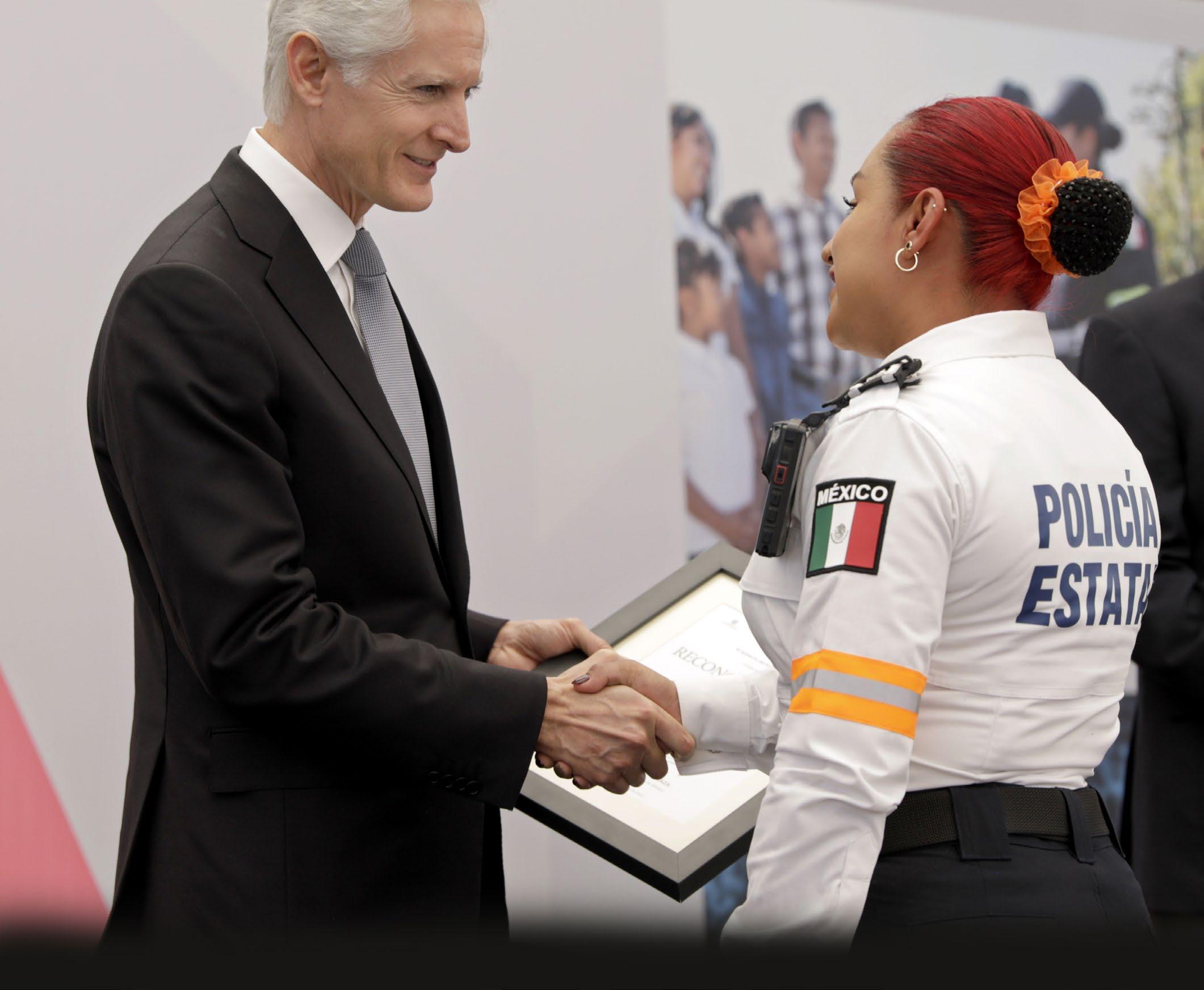 En el marco del día del policía mexiquense el gobernador del Estado de México, Alfredo Del Mazo Maza, reconoció el trabajo diario que realizan para resguardar la integridad de miles de habitantes y destacó que hoy en día, la entidad cuenta con una mejor corporación gracias a la creación de la Secretaría de Seguridad (SS). “Por sus aportaciones, por su lealtad, por su compromiso, en su día premiamos sus sacrificios, su trabajo, su esfuerzo, refrendamos nuestro respeto hacia las mujeres y hombres que portan el uniforme de la policía del Estado de México y todos los días están listos y listas para cumplir con su misión de servir y proteger a la sociedad. Hoy, a poco más de cinco años de haber iniciado nuestra administración, podemos decir con orgullo que tenemos a una mucho mejor policía en el Estado de México, que está al cuidado de las familias mexiquenses”.