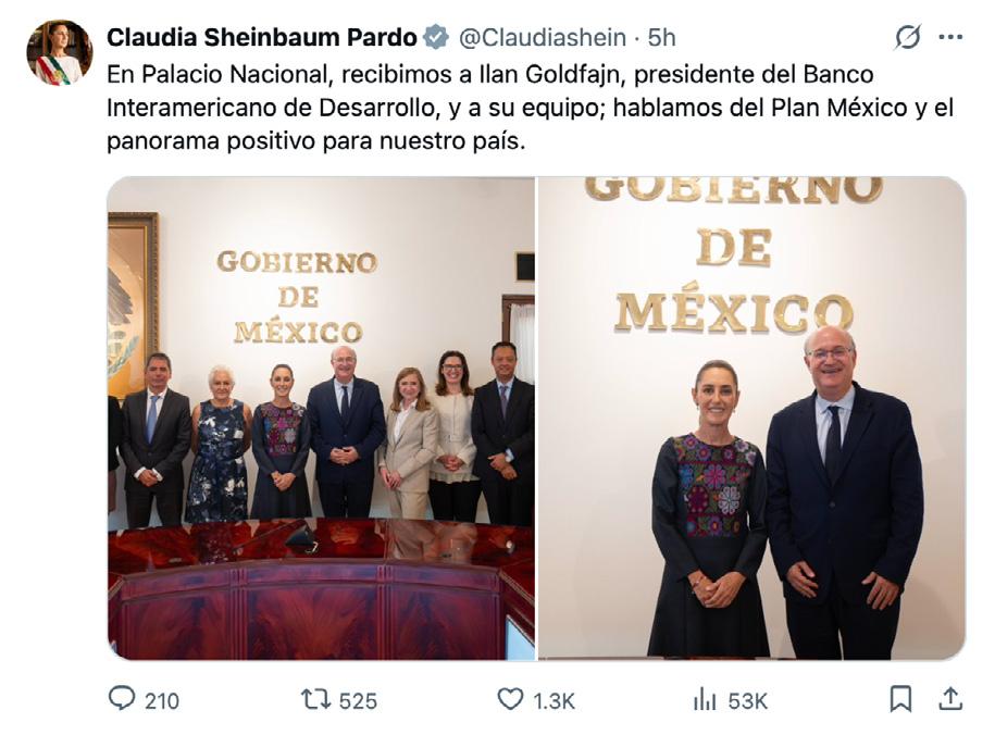 En diciembre de 2024, Goldfajn visitó por primer vez México y afirmó entonces la disposición del organismo para respaldar a México en el proceso de relocalización de empresas conocido como ‘nearshoring’.