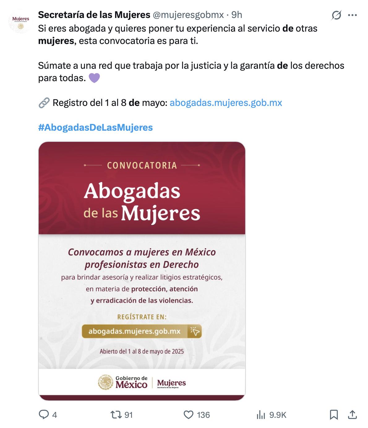Las interesadas podrán registrarse desde hoy y hasta el 8 de mayo en ESTA PÁGINA. Y entre los requisitos para poder aplicar es que deberán contar con experiencia en atención con perspectiva de género y litigio estratégico, ser de nacionalidad mexicana y contar con título y cédula profesional de la licenciatura en Derecho. Posteriormente, el proceso de selección y evaluación se realizará de manera conjunta entre la Secretaría de las Mujeres y las IMEF, ya que la contratación y retribución a las Abogadas de las Mujeres se realizará con los recursos aprobados en el marco del PAIBIM, a través de las IMEF, en su calidad de instancias ejecutoras del recurso.
