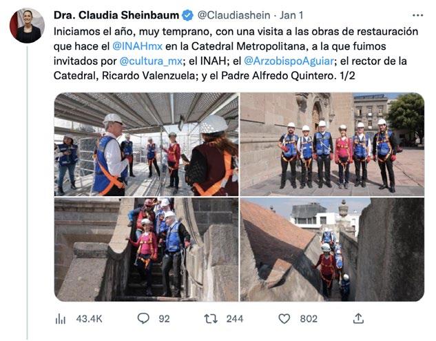 “Estamos aquí iniciando el año con el Cardenal Carlos Aguiar, a quien le agradecemos enormemente que nos haya permitido subir a este patrimonio histórico de nuestra ciudad y al Instituto Nacional de Antropología”, señaló en un vídeo difundido en sus redes sociales.