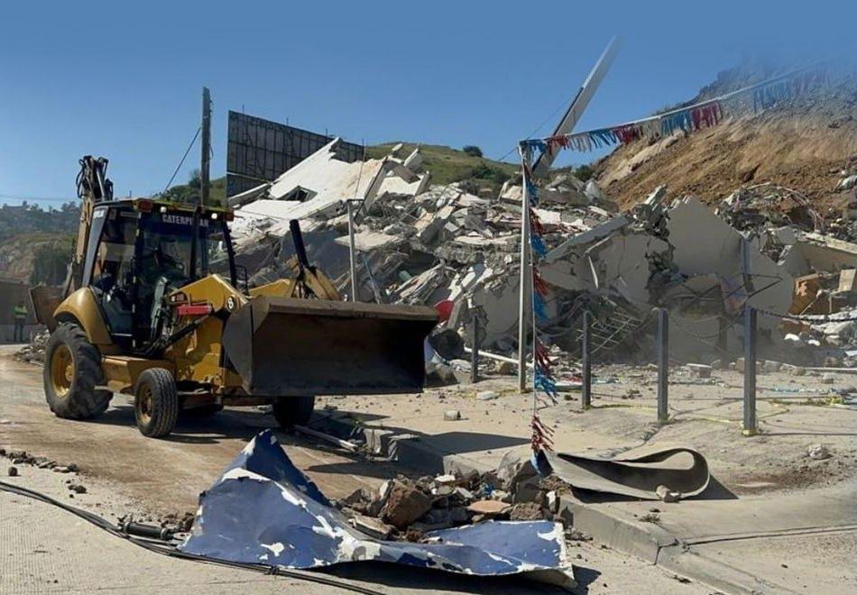 Los escombros del primer edificio cayeron de casi 20 metros de altura hasta un comercio de venta de autos usados, que estaba situado a la orilla de la carretera libre que va al municipio de Playas de Rosarito. En esta ocasión, transcurrieron cinco días de monitoreo, mismo en los que Protección Civil y agentes de la Guardia Nacional vigilaron el inmueble; durante el derrumbe tanto el cuerpo de bomberos y policía municipal se mantuvieron alerta para intervenir en caso de que se diera un riesgo latente en contra de la población. Al respecto, el Ayuntamiento de Tijuana, encabezado por Montserrat Caballero Ramírez, dio a conocer que se dispondrá de 200 millones de pesos de recursos para reparaciones en el fraccionamiento, con la posibilidad de ejercer un 50 por ciento más.