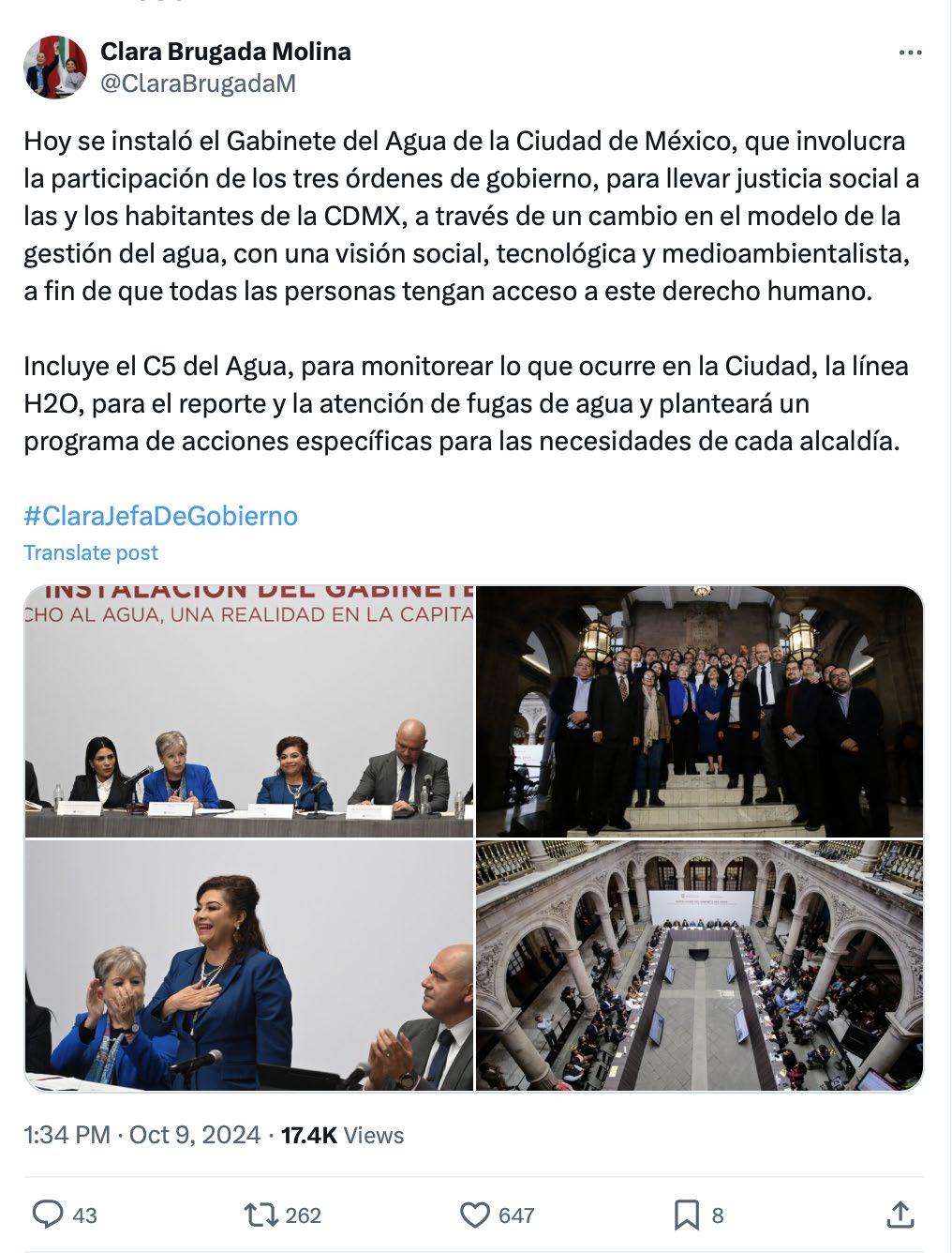 La creación de una línea telefónica denominada ‘H20 agua’ para que la ciudadanía pueda hacer reportes de manera directa relacionadas con el servicio de agua, así como la instalación de un C5 del agua, son algunos de los proyectos que plantea la jefa de Gobierno, Clara Brugada, para atender la crisis de agua que afecta a la Ciudad de México. Durante la instalación del Gabinete de Agua en el que participarán autoridades del Gobierno de la CDMX, federal y de entidades del Valle de México, la mandataria capitalina adelantó que este gabinete es un instrumento que permitirá “coordinar y resolver” uno de los temas prioritarios para la ciudadanía, como lo es el abastecimiento de agua.