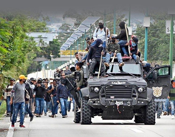 Presuntos transportistas se enfrentan a elementos de la GN y estatal en Chilpancingo, Guerrero Transportistas y pobladores de comunidades de los municipios de Chilpancingo, Mochitlán y Quechultenango entraron a la ciudad tras romper el cerco de la Policía Estatal y la Guardia Nacional. La irrupción de unos 3 mil pobladores de los municipios de Mochitlán y Quechultenango y de la comunidad de Petaquillas, en Chilpancingo, en el estado de Guerrero, obligaron a replegarse a los elementos de la Guardia Nacional y la Policía Estatal. Los manifestantes tomaron un vehículo de la policía estatal, de los conocidos como rinocerontes, y con ese han ido avanzando por la ciudad.