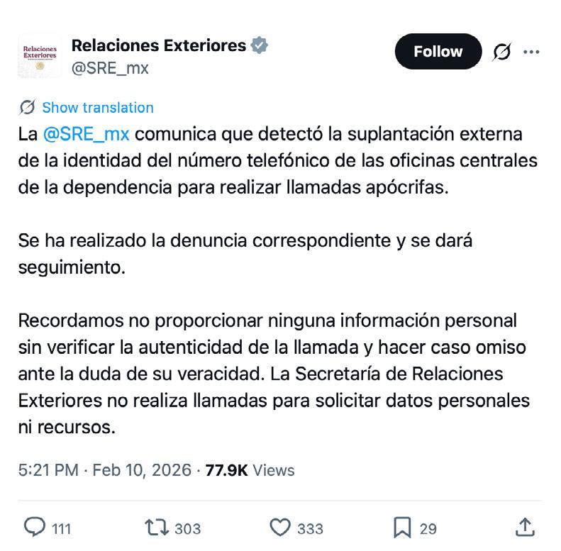 La SRE emitió un comunicado en redes sociales informando sobre “la suplantación externa de la identidad” del número de teléfono de la sede de Avenida Juárez 20, colonia Centro, Cuauhtémoc. Tras realizar la denuncia correspondiente, se continuará con el seguimiento del incidente. La cancillería instó a no proporcionar ninguna información personal sin antes verificar que se trate de una comunicación auténtica realizada por miembros de la institución. “La Secretaría de Relaciones Exteriores no realiza llamadas para solicitar datos personales ni recursos”, escribieron en el comunicado de X. El número de la institución es: 52 5536865100