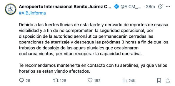 AICM ANUNCIA CIERRE TEMPORAL DE OPERACIONES POR INUNDACIONES