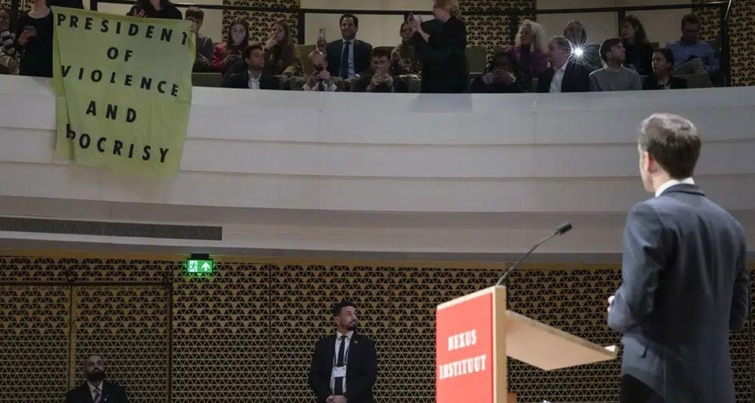 Manifestantes interrumpen discurso del presidente Emmanuel Macron en La Haya