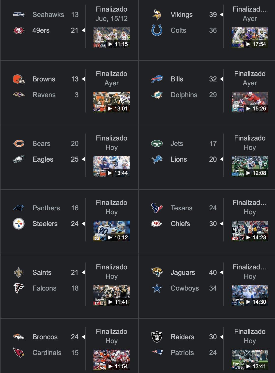 yardas; los Dolphins son segundos del este de la Americana. Los San Francisco 49ers derrotaron 21-13 a los Seattle Seahawks en el inicio de la semana 15 de la temporada 2022 de la NFL, el mejor futbol americano del mundo.