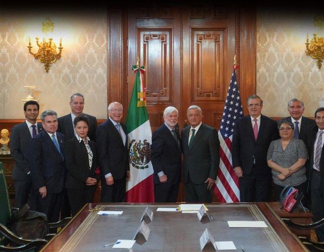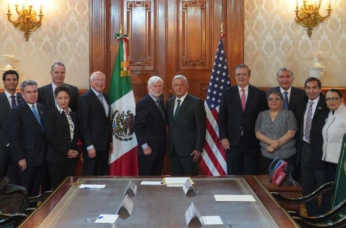 Del Gobierno de México lo acompañaron las secretarias de Economía, Raquel Buenrostro Sánchez y de Seguridad y Protección Ciudadana, Rosa Icela Rodríguez Velázquez; así como los secretarios de Gobernación, Adán Augusto López Hernández; de Relaciones Exteriores, Marcelo Ebrard Casaubon y de Hacienda y Crédito Público, Rogelio Ramírez de la O. La delegación de autoridades de Estados Unidos que hoy se reunió con el presidente López Obrador en Palacio Nacional estuvo integrada por el embajador en México, Ken Salazar; la jefa de Cancillería, Stephanie Syptak-Ramnath; el asesor principal de la Oficina Ejecutiva para el Hemisferio Occidental del Departamento de Estado, Marcos Mandojana; el director para el Hemisferio Occidental del Consejo de Seguridad Nacional, Ramón Escobar y el ministro consejero para asuntos políticos de la Embajada de Estados Unidos, Brian Naranjo. M