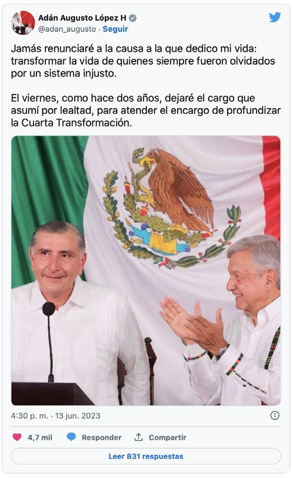 Adán Augusto López Hernández, secretario de Gobernación, adelantó que el próximo viernes dejará su cargo para buscar la coordinación nacional de la defensa de la Transformación por Morena y el próximo lunes iniciará sus recorridos por el país. “Yo no voy a renunciar, le he pedido al Presidente que me releve del cargo de Secretario de Gobernación, seguramente el viernes por la mañana haré efectiva esa petición de manera formal, dejó este cargo porque voy en búsqueda de otro encargo”.