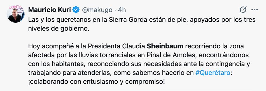 Después de las afectaciones en Querétaro que dejaron las lluvias e inundaciones, la presidenta Claudia Sheinbaum Pardo y el gobernador Mauricio Kuri, de Acción Nacional, recorrieron las zonas afectadas. El gobernador Kuri destacó la colaboración con el gobierno federal, en apoyo a las personas damnificadas en su estado. “Las y los queretanos en la Sierra Gorda están de pie, apoyados por los tres niveles de gobierno.”