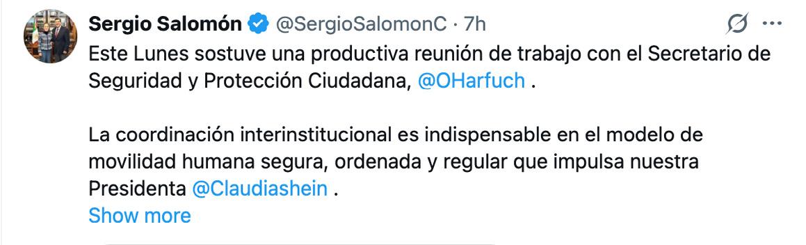 Sergio Salomón Céspedes, titular del Instituto Nacional de Migración (INM), sostuvo este lunes una reunión con el secretario de Seguridad y Protección Ciudadana, Omar García Harfuch. En la reunión, que Céspedes calificó como “productiva”, ambos revisaron el modelo
