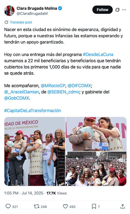 Clara Brugada, jefa de Gobierno de la Ciudad de México, hizo entrega del programa social local ‘Desde la Cuna’ en la capital del país. Este programa fue creado en noviembre del año pasado cuando la mandataria capitalina