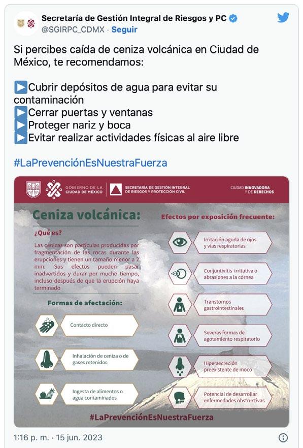 La Secretaría de Gestión Integral de Riesgos y Protección Civil de la Ciudad de México exhortó a la población a tomar precauciones ante la posibilidad de caída de ceniza en algunas alcaldías, como consecuencia de la más reciente actividad el volcán Popocatépetl. A través de la cuenta de Twitter, señaló que la ceniza podría caer en las alcaldías Cuajimalpa, Álvaro Obregón, Magdalena Contreras,
