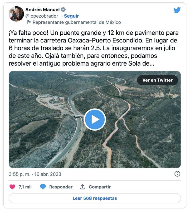 En lugar de 6 horas de traslado se harán 2.5. La inauguraremos en julio de este año. Ojalá también, para entonces, podamos resolver el antiguo problema agrario entre Sola de Vega y San Vicente Coatlán y lograr la paz”, señaló el presidente López Obrador. Junto con el tuit, el presidente López Obrador subió un video del recorrido en helicóptero que hizo por las obras de la autopista Oaxaca-Puerto Escondido. López Obrador también inauguró en Oaxaca caminos artesanales en el distrito de Nochixtlán y en Coxcaltepec Cántaros.