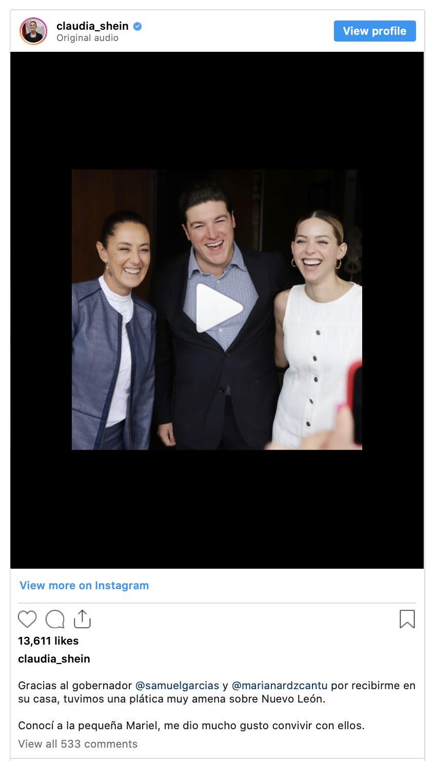 través de su cuenta de Instagram, Claudia Sheinbaum, agradeció al gobernador por recibirla en su casa y tener una charla amena sobre Nuevo León, además de conocer a la nueva integrante de su familia. En el video publicado por Instagram, Samuel García, comentó que llegará a la Ciudad de México para escuchar el concierto gratuito que dará la cantante española, Rosalía, en el Zócalo capitalino Por el momento se desconoce sobre qué temas trataron en la reunión.