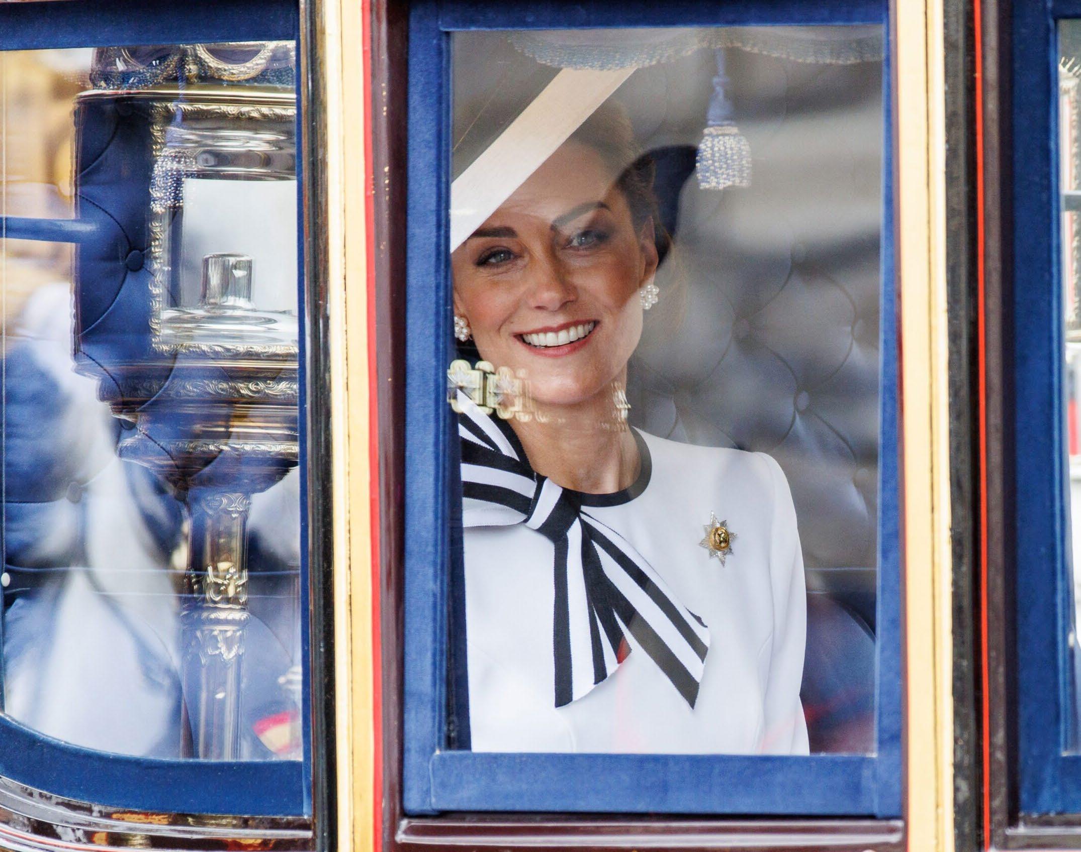 Media hora después, apareció a bordo de la Carroza de Cristal junto a sus hijos, Jorge, Carlota y Luis, saludando a los devotos que desafiaron la incesante lluvia londinense. Se la vio sonriente y compartiendo complicidades con Carlota, que no dejó de jugar y reír a lo largo del trayecto por la majestuosa avenida de The Mall, hasta el espacio ceremonial Horse Guards Parade, donde tuvo lugar la parada militar. Desde un balcón de la Oficina del Mayor General, la familia siguió una ceremonia coreografiada durante meses, con la participación de más de 1.250 militares. Kate atendía
