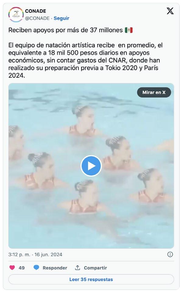 En dicha información la comisión que rige Ana Guevara especifica que las “sirenas mexicanas” reciben todos los apoyos para su entrenamiento en las instalaciones del Centro Nacional de Alto Rendimiento (CNAR) tanto para los Juegos Olímpicos de Tokio como para París. “Cuentas con una fosa de