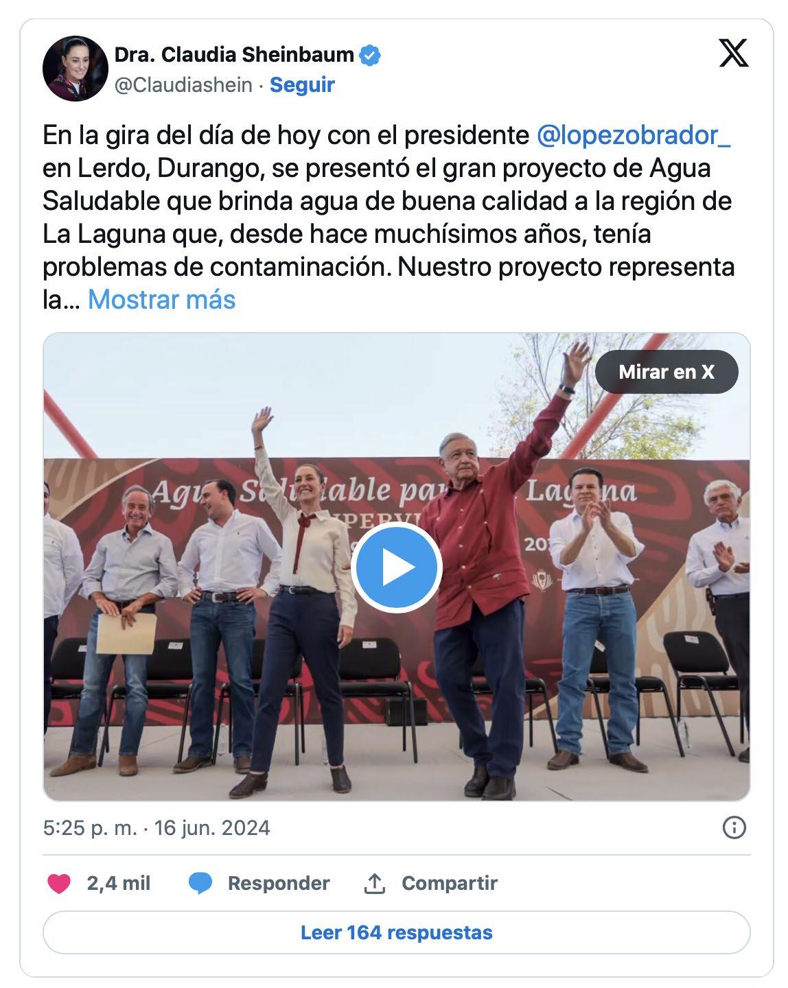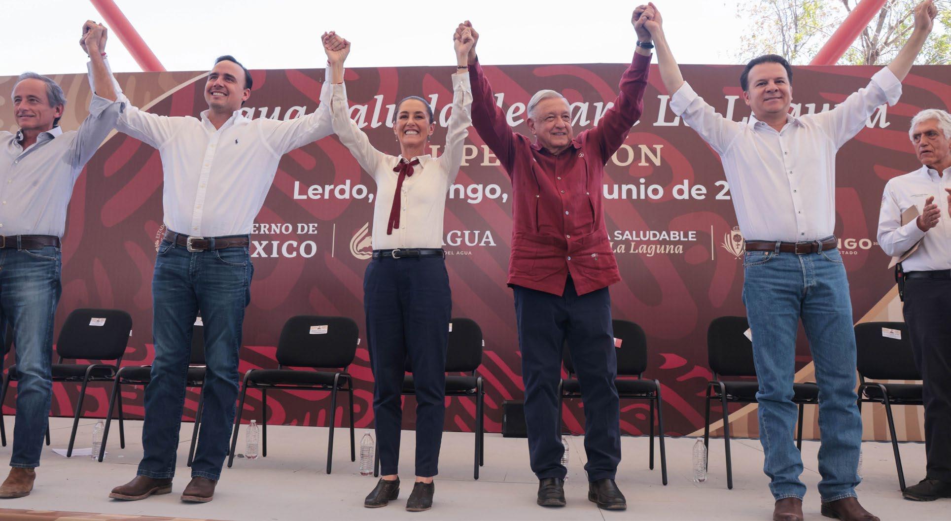 La virtual presidenta, Claudia Sheinbaum, mencionó que atender el problema del agua con arsénico representa que el agua es un derecho humano y no un privilegio ni una mercancía.“La continuidad de la transformación también involucra la continuidad del proyecto de Agua Saludable. Vamos a seguir trayendo agua a todo el país como reconocimiento del derecho al acceso al agua”, comentó. En el evento estuvieron presentes los gobernadores de Durango y Coahuila Esteban Villegas y Manolo Jiménez respectivamente. Ambos mandatarios priistas vitorearon ¡presidenta, presidenta!, en sus respectivas intervenciones.