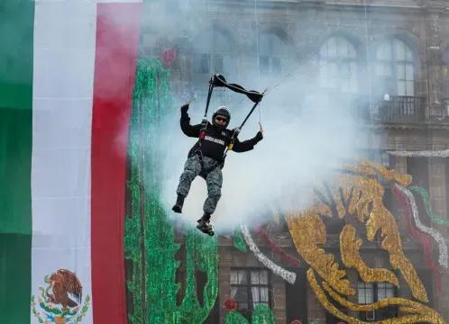 “Guerreros Mexicas” realizaron un salto de caída libre en la Plaza de la Constitución, entre ellos una mujer. MIÉRCOLES