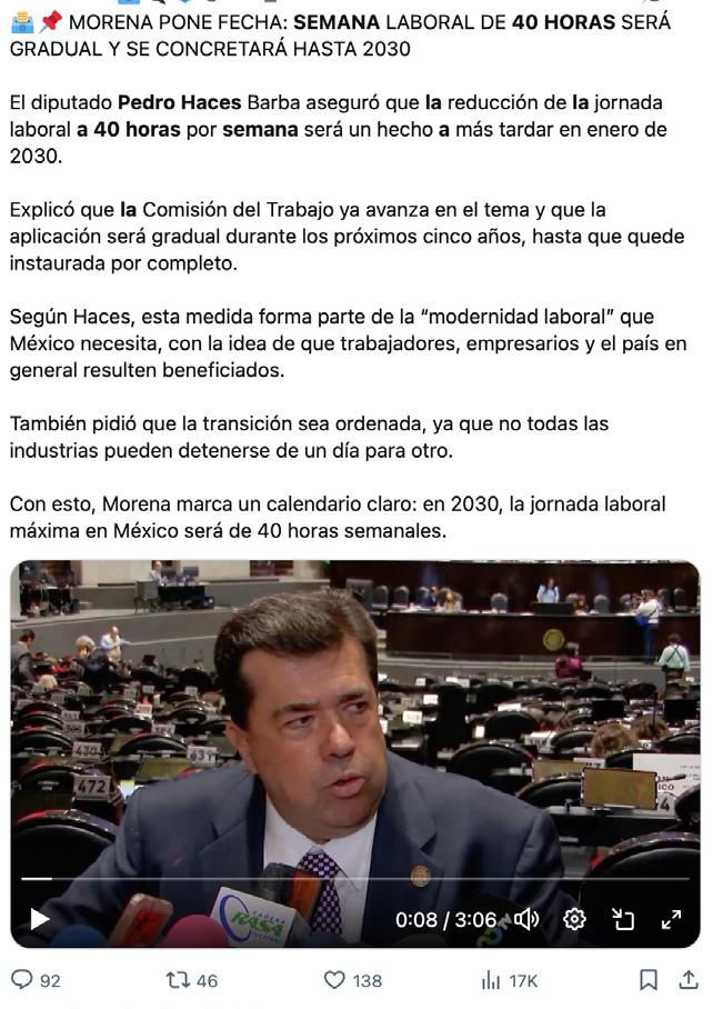 El coordinador de Operación Política de Morena en San Lázaro, Pedro Haces Barba, informó que la jornada laboral de 40 horas será gradual y se espera que para 2030 esté implementada. En entrevista en la Cámara de Diputados, el diputado morenista detalló que la reforma será una modernidad laboral de México, y es una suma de voluntades encontradas en torno a un propósito, que a los trabajadores les vaya bien. Luego de que empresarios se opusieran a la reducción de la jornada laboral, el legislador dijo que “todo mundo tiene que acoplarse a la modernidad”, y que las 40 horas son “parte de la modernidad laboral en México”.