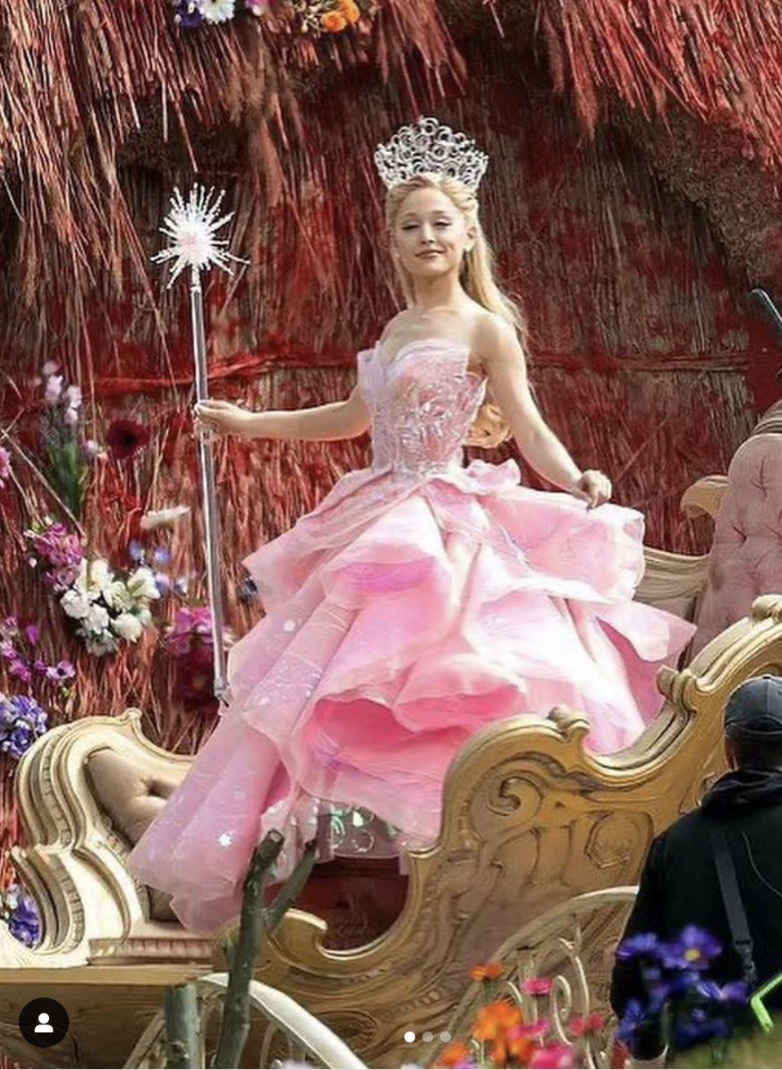 La película ‘The Wicked’, coprotagonizada por Ariana Grande ya está en proceso de filmación; así que, algunas imágenes de la cantante se filtraron en redes sociales, donde se le ve vestida como Glinda, la bruja buena. Las primeras imágenes de Ariana Grande en la película ‘The Wicked’, dirigida por Jon M. Chu, por fin salieron a la luz después de que se filtrara el vestuario que usará la cantante de ‘The Wizard And I’, para el personaje de Glinda. En las fotografías se observa a Ariana Grande como Glinda, se observa que tiene el cabello teñido de rubio, como actualmente lo usa, porta una corona brillante un vestido pomposo de color rosa y una bastón de cristal que, al parecer, será su barita mágica. Director revela primer vistazo de Elphaba, en Wicked