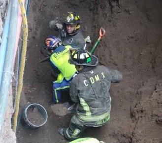 Bomberos de la ciudad realizan labores en el socavón, en donde se rescató con vida a un hombre y se labora para el rescate de dos más, a uno de ellos se le facilita la respiración con equipo de respiración autónomo.