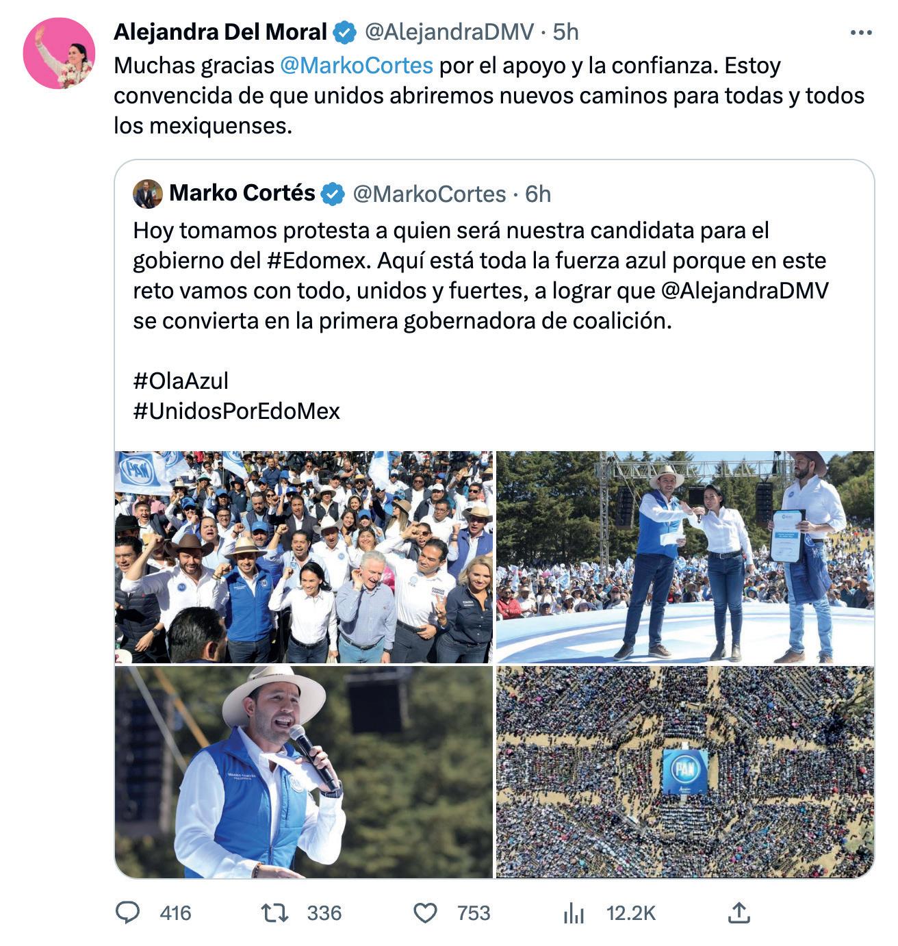 las senadoras Kenia López Rabadán y Xóchitl Gálvez Ruiz, la presidenta municipal de Huixquilucan, Romina Contreras Carrasco, alcaldes y legisladores. “Este arroz ya se coció”, asegura “Alito” En su cuenta de Twitter, tras la toma de protesta de Alejandra del Moral como candidata del PAN, el dirigente nacional del PRI, Alejandro Moreno Cárdenas, dijo que el apoyo del PAN garantiza el triunfo electoral de la coalición en el Estado de México. “¡Este arroz ya se coció! Miren el enorme respaldo de la militancia de Acción Nacional para Alejandra del Moral, es claro que ella será la próxima gobernadora del Estado de México, porque es una mujer valiente, que conoce su tierra y a las familias mexiquenses. ¡Vamos a ganar!”, dijo.M