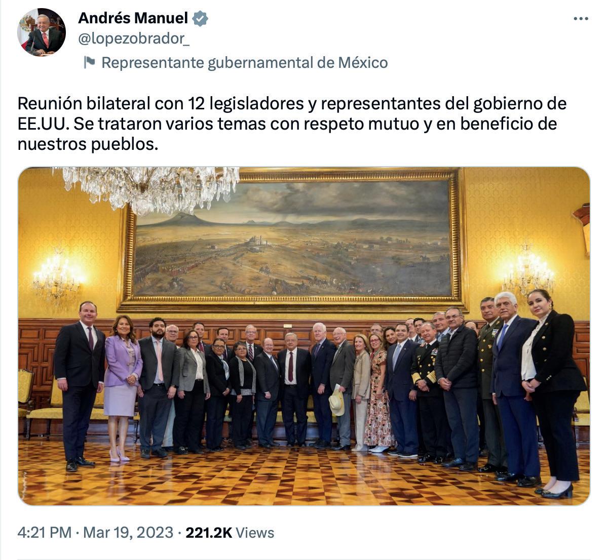 El presidente Andrés Manuel López Obrador aseguró que en su reunión bilateral con un delegación de 12 legisladores estadounidenses se vieron varios temas como seguridad, energía y economía “con respeto mutuo y en beneficio” de México y Estados Unidos. Por medio de sus redes sociales, el presidente López Obrador compartió una fotografía del encuentro. “Reunión bilateral con 12 legisladores y representantes del gobierno de EU. Se trataron varios temas con respeto mutuo y en beneficio de nuestros pueblos”.