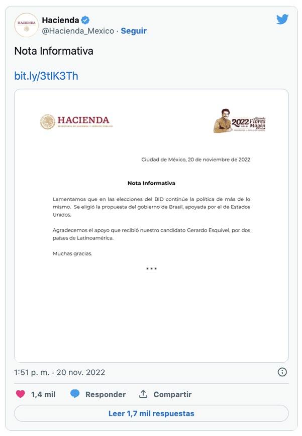 a un latinoamericano después de la súbita destitución del estadunidense Mauricio Claver-Carone por violaciones al código de ética. Gerardo Esquivel le deseó éxito en su gestión a Ilan Goldfajn y agradeció al gobierno federal por haberlo propuesto para presidir el organismo.