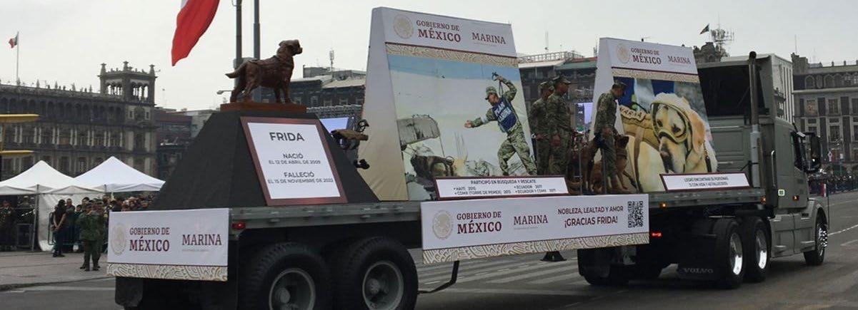 Durante el 112 aniversario del inicio de la Revolución Mexicana, un carro temático de la Secretaría de la Marina fue decidido a la perrita rescatista Frida”