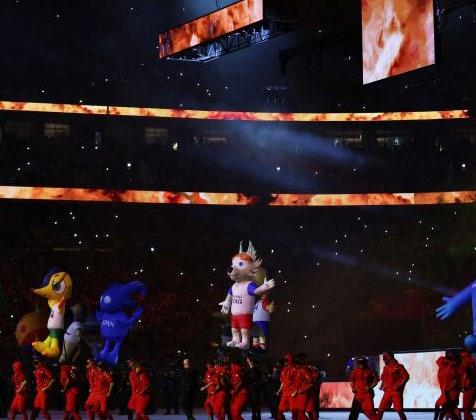de las Selecciones participantes fueron presentadas en el campo acompaña das de un show de luces. También se escucharon las canciones de los ante riores mundiales mientras todas las mascotas de los Mundiales entraban a la ceremonia. Jungkook el integrante de BTS hizo su entrada presentando y cantando la canción oficial del Mundial de Qatar 2022 ‘Dreamers’ Al terminar la interpretación, el Emir de Catar Jalifa bin Hamad Al Thani dio unas palabras para el inicio del Mundial e invitó a que todos disfruten de la Copa del Mundo.