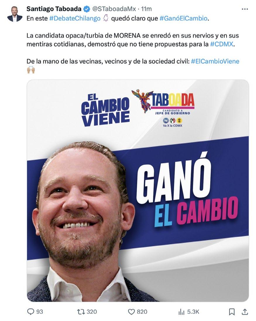 El panista Santiago Taboada ha pedido a los habitantes de Ciudad de México salir a votar el 2 de junio para terminar con los gobiernos de izquierda y dar paso al primer sexenio de la oposición. “La derrota es clara”, dijo en alusión a su adversaria, Clara Brugada, canddiata de Morena. Taboada ha referido a las marchas ciudadanas en defensa del INE, del Poder Judicial y por los derechos de las mujeres. “Somos una ciudad aspiracionista porque trabajamos todos los días y somos la resistencia porque nos resistimos a vivir igual, nos resistimos a la inseguridad, a la falta de agua, a un Metro que prácticamente se cae todos los días, nos resistimos a la desigualdad a la que Morena nos metió desde hace 27 años, resistimos a los malos gobiernos”, dijo.