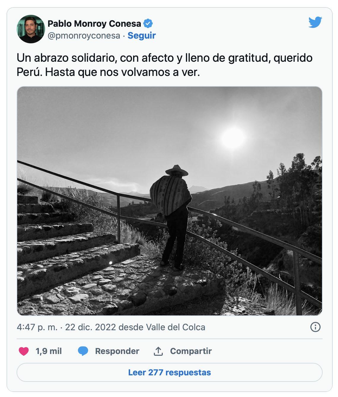 El embajador de México en Perú, Pablo Monroy Conesa, publicó un mensaje de despedida en Twitter, ante su eventual regreso a este país tras ser declarado persona non grata por el gobierno peruano.Y con ello, se le diera un ultimátum para abandonar Perú ante lo que la cancillería del país sudamericano calificó como expresiones injerencistas del gobierno mexicano. “Un abrazo solidario, con afecto y lleno de gratitud, querido Perú. Hasta que nos volvamos a ver”, escribió Monroy en Twitter, junto a una foto del Valle del Colca. Hace dos día, Monroy Conesa fue declarado persona non grata en Perú por las expresiones de altos funcionarios de México sobre la vida interna de ese país.
