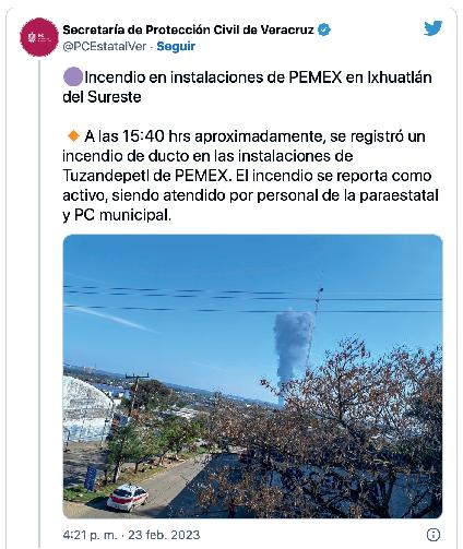 Las llamas son combatidas por elementos de Protección Civil municipal y del propio Pemex. De manera precautoria, se realizó la evacuación de las instalaciones de la Universidad de Ixhuatlán del Sureste. Pemex informó alrededor de las 21 horas que se logró extinguir el incendio “suscitado en el equipo de perforación PM-119 que daba mantenimiento a la Cavidad Tuzandepetl-331, mismo que forma parte del proyecto de rehabilitación de cavidades de la Planta de Almacenamiento Estratégico Tuzandepetl, ubicada en el municipio de Ixhuatlán del Sureste, Veracruz”.