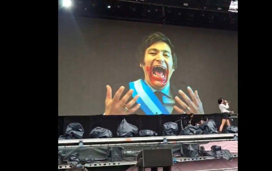 sociales fue criticada la secuencia que finalizaba con la explosión de la cabeza del mandatario. El video de poco más de un minuto, que se proyectó en las pantallas del escenario Samsung, se volvió viral y no pasó desapercibido entre los asistentes del festival realizado en el Hipódromo de San Isidro. La puesta en escena, que incluyó una escenografía repleta de residuos, fue registrada por el público y rápidamente compartida en redes sociales, donde generó un fuerte impacto. Ante la polémica que se armó a partir del video, la banda -integrada por Lucila Storino (voz), Juana Gallardo (bajo) y Ramiro Pampin (batería)- realizó un posteo su cuenta oficial de Instagram