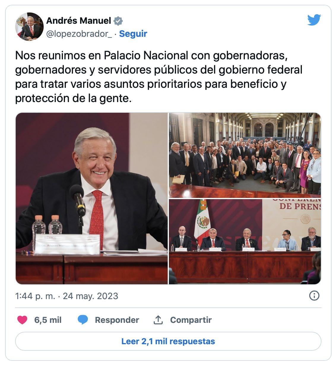 Nos reunimos en Palacio Nacional con gobernadoras, gobernadores y servidores públicos del gobierno federal para tratar varios asuntos prioritarios para beneficio y protección de la gente”