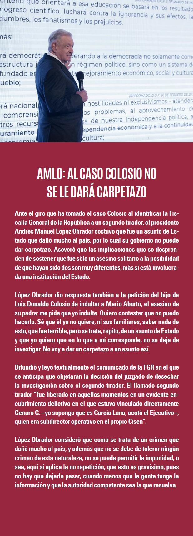 Pero si debe servir de experiencia. “Este gobierno de López Obrador tiene que dar la explicación sobre Ayotzinapa, ya no sobre Colosio”. “Quizás lo que debe pasar ahora es que se aprenda de esa investigación mal llevada y de la duda que genera en la ciudadanía, para que no se repita exactamente lo mismo en el caso de los estudiantes de la Normal de Ayotzinapa”, pues a su juicio eso es lo que toca aclarar a esta administración.