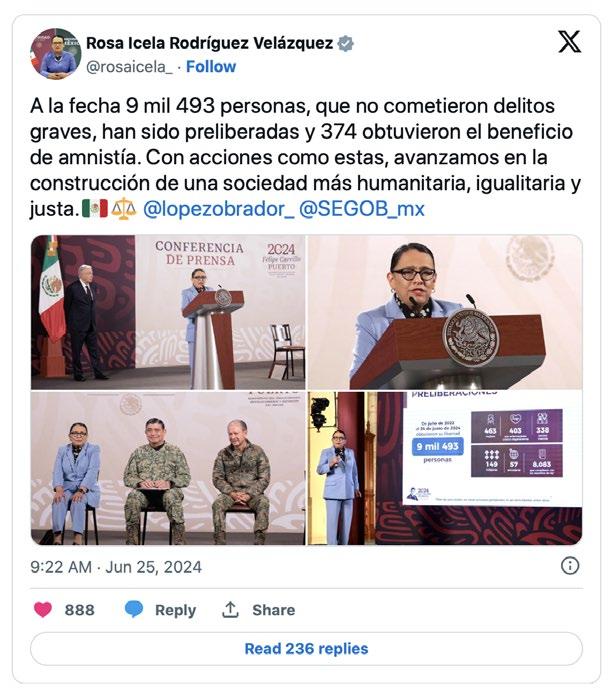 Obrador ha hecho hincapié en el programa de Amnistías, encabezado por la Secretaría de Gobernación, del que se desprenden 374 libertades otorgadas a 127 mujeres y a 247 hombres, de los cuales 35 son personas indígenas. En ese sentido, la titular de la SSPC dijo que hay 50 resoluciones que se han calificado como positivas por parte de la “Comisión de Amnistía” y que se encuentran en estudio para su confirmación del Juez competente.