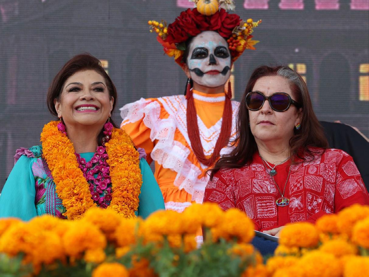 que convoca a otras divinidades femeninas del agua, del viento y del maíz, así como a los pueblos, saberes, animales y corazones que dan vida a México. En el recorrido también se pueden apreciar representaciones de la Reina Roja de Palenque, Cuerauáperi de Michoacán e Ixmukane de la región maya, además de figuras emblemáticas como el ajolote, el jaguar, el guajolote y el maíz, que acompañan el camino espiritual hacia el Mictlán, así como un tapete monumental elaborado con más de 100 mil plantas de cempasúchil, provenientes del suelo de conservación de esta capital. Asimismo, la Jefa de Gobierno invitó al público a visitar el tapete artesanal de semillas y maíz, elaborado por artistas de Huamantla, Tlaxcala, y el portal floral realizado por artesanos de la alcaldía Iztacalco, que enmarcan la catedral y ofrecen un escenario único para la convivencia familiar.