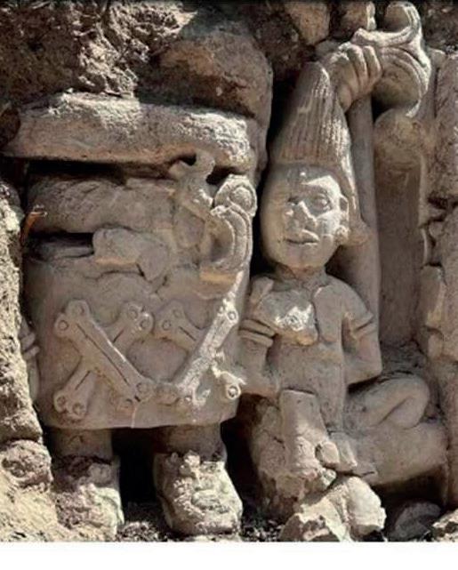 “Como ustedes ven, se trata de un cautivo, por las manos atadas; está tomado por una gobernante mujer que tiene unas faldas con huesos cruzados y le está tomando de los cabellos para expresar que se trata de un cautivo. En la parte superior de la Acrópolis hay una serie de recintos con este tipo de esculturas, adosadas a las fachadas”, dijo.
